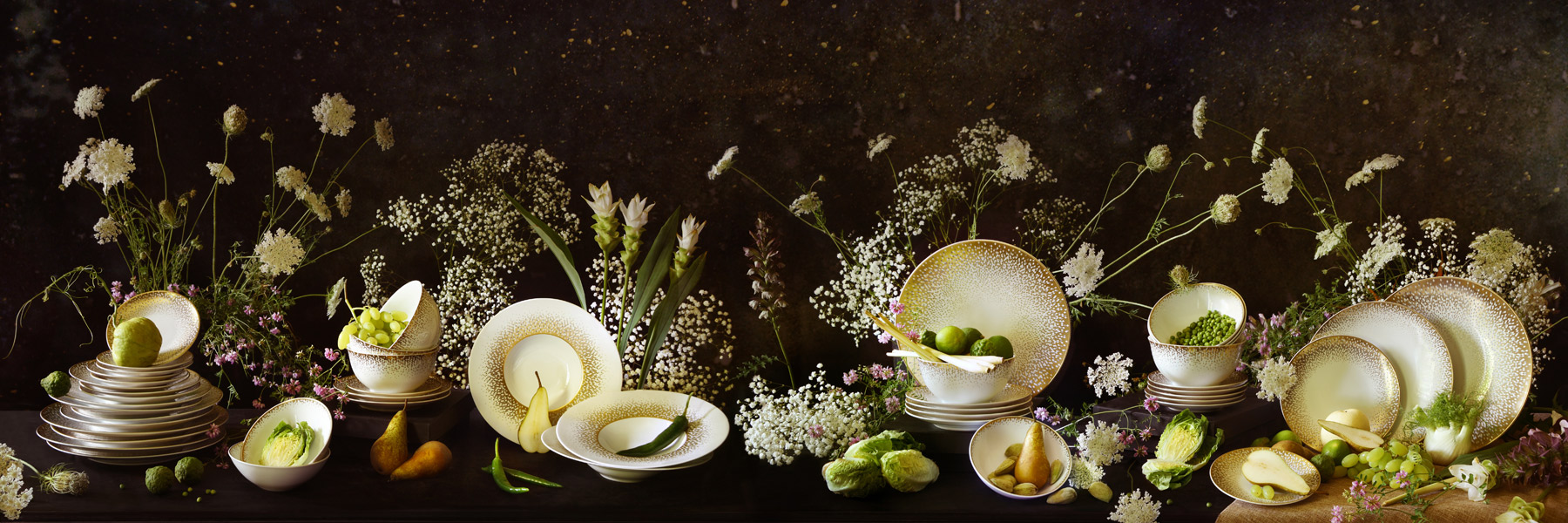 Telle une dispersion d’étoiles filantes, Souffle d’Or est une collection féérique et étincelante, une invitation au voyage stellaire, au milieu des astres qui se rassemblent puis s’éparpillent. Une constellation fins losanges d’or satiné ou de gris irisé se métamorphose en fine poussière d’étoiles, témoignant du savoir-faire et de la technicité qui font toute la renommée des décors de la Maison Haviland.