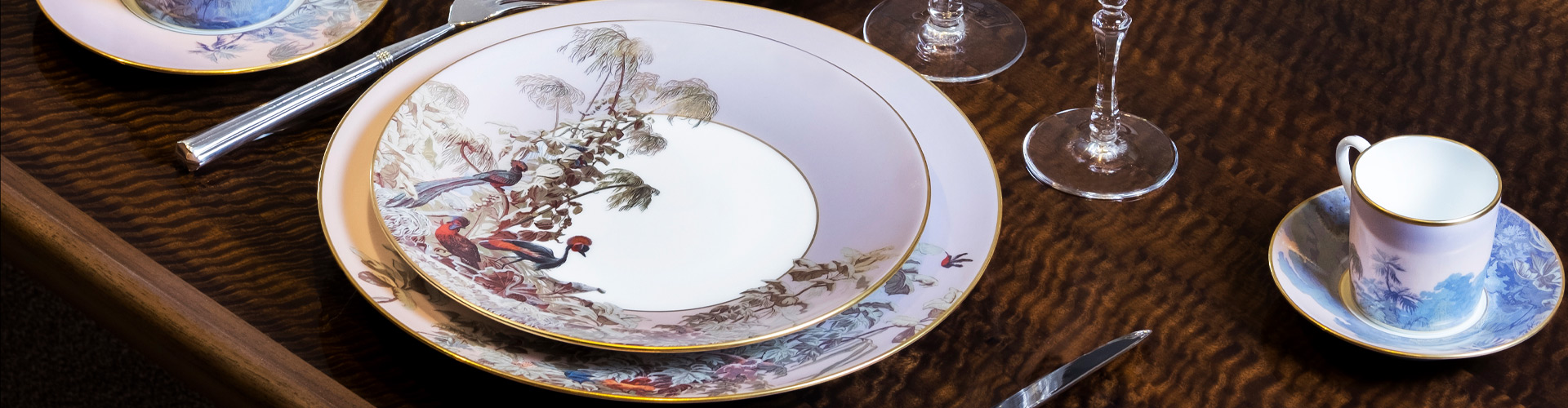La Maison Haviland s'associe à la Manufacture Zuber pour créer la collection Le Brésil, inspirée d’un décor panoramique de 20 lés, créé par Joseph Fuchs en 1862. Fondée en 1790 et établie à Rixheim près de Mulhouse, la Manufacture Zuber est la plus ancienne Manufacture de papier peint encore en activité et la dernière au monde à fabriquer des décors panoramiques à la planche. Cette collection saisit l'essence de la forêt tropicale d’Amazonie, où faune et flore se rencontrent dans un paysage luxuriant. Une multitude d’oiseaux extraordinaires (paons, grues, faisans, flamants roses, aras et colibris) parés de longs plumages aux couleurs chamarrées y sont représentés, avec pour arrière-plan le fleuve et la mangrove. Haviland met tout son savoir-faire porcelainier pour retranscrire avec précision la richesse chromatique et la précision du détail de ce décor enchanteur.